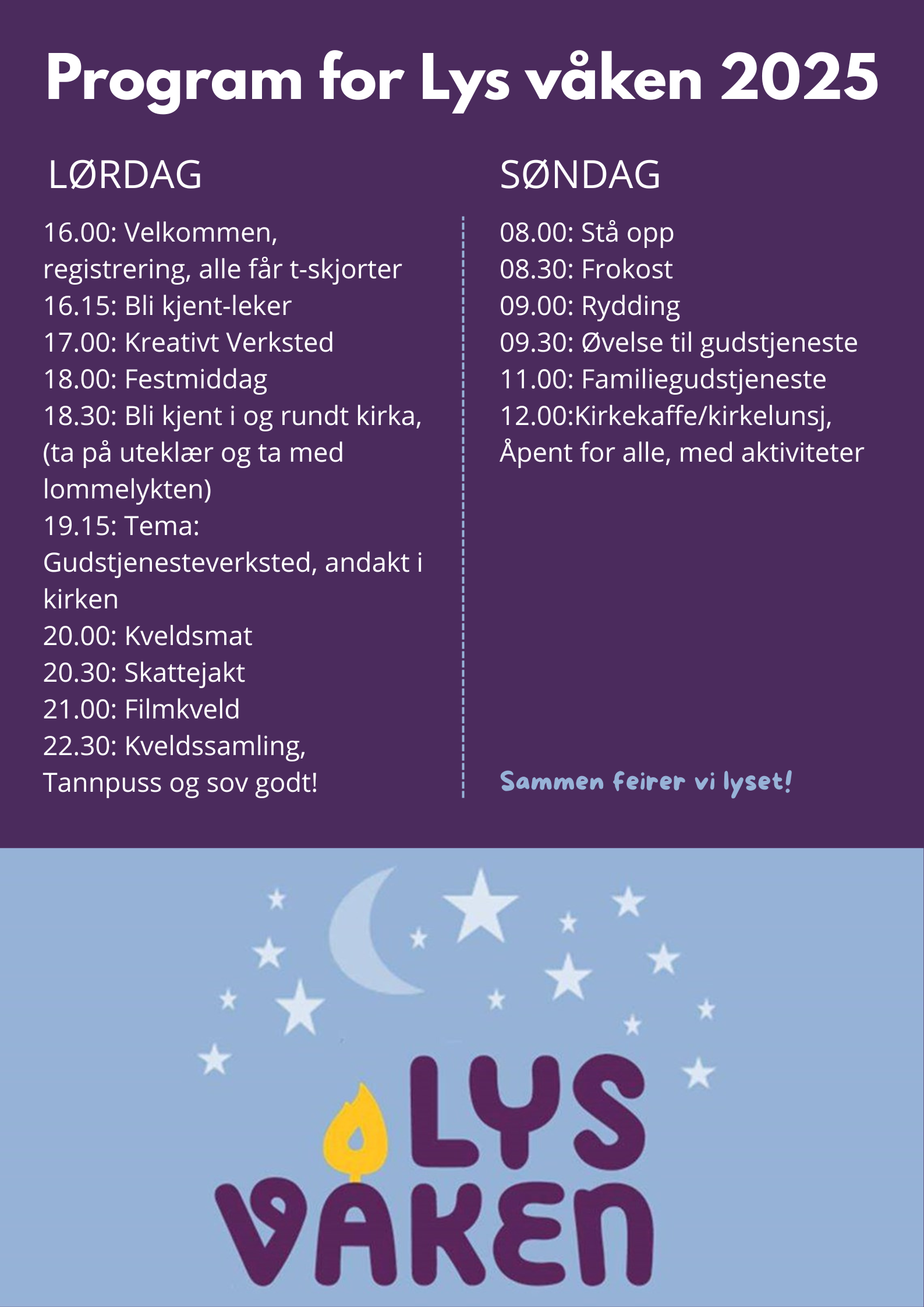 Lys våken handler ikke om å være våkne hele natta, men om å være lys våkne for hverandre og for oss selv. Rundt om king i Norge overnatter tusenvis av barn i kirker natt til første søndag advent. Bli med på skattejakt, lek, sang, kreativt verksted og overnatting i Nordreisa kirke.