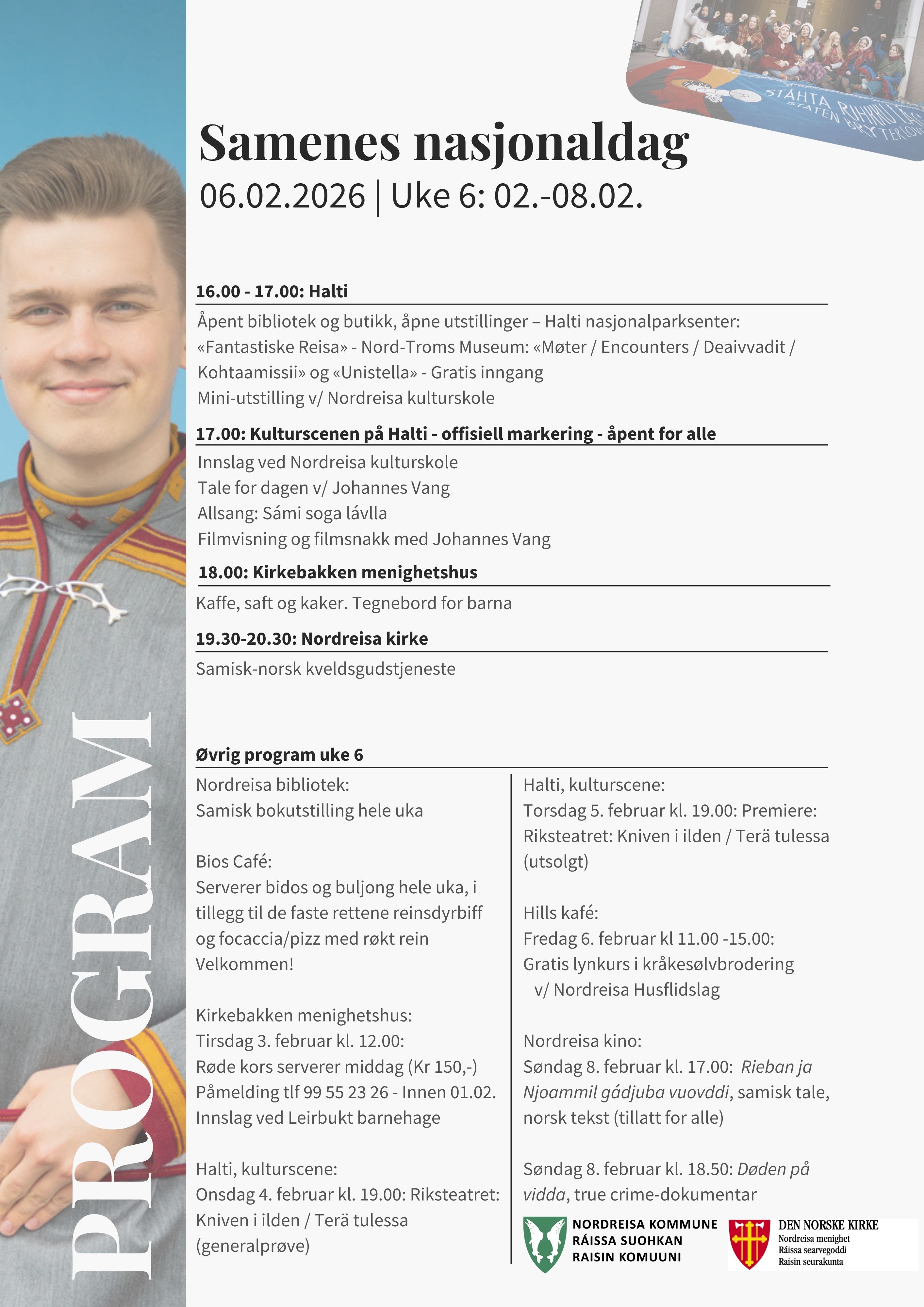 Gudstjenesten og kirkekaffen er en del av den offisielle markeringen av Samenes nasjonaldag i Nordreisa kommune. Se Kommunens Facebook-arrangement her.